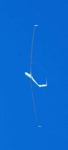 My plan was to capitalize on my wing-loading and high-speed performance advantage. The Antares 20E is the highest performance glider here except for Dick Butler's highly modified ASW-22. While the open class machines have higher max glide ratios, they use older airfoils not as good at high speed, and fly at lower wing loadings. The Antares climbs as well or a bit better, partly because its very maneuverable (the open gliders are not), and partly better airfoil. I wish I could get it heavier than the 10.7 lbs/ft2 I'm flying ! Anyway, plan was to catch and pass the others, go further into the cylinder and have them again in front of me for markers on the second leg.